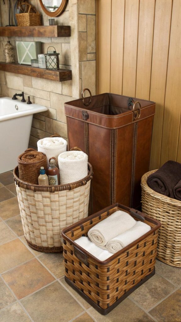 Use woven or leather storage baskets to keep your bathroom organized while staying on theme. These baskets are perfect for holding towels, toiletries, or even extra toilet paper. Woven baskets in neutral tones or leather ones in darker shades like brown or tan can be easily incorporated into your rustic bathroom setup.