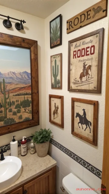 Adding framed art to your western bathroom can help personalize the space. Look for artwork that incorporates elements of the wild west, such as cowboy silhouettes, desert landscapes, or vintage rodeo posters. These pieces bring character to the walls and serve as focal points in the room. Choose wooden frames to match the overall rustic theme.