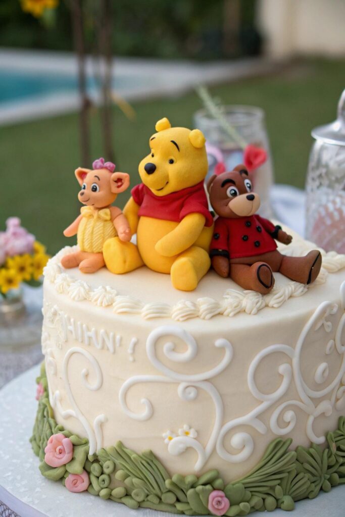 Design a cake topper featuring Winnie the Pooh and his friends. Use fondant or wooden cutouts to create the characters. Place the topper on the main cake or cupcakes for a sweet finishing touch.