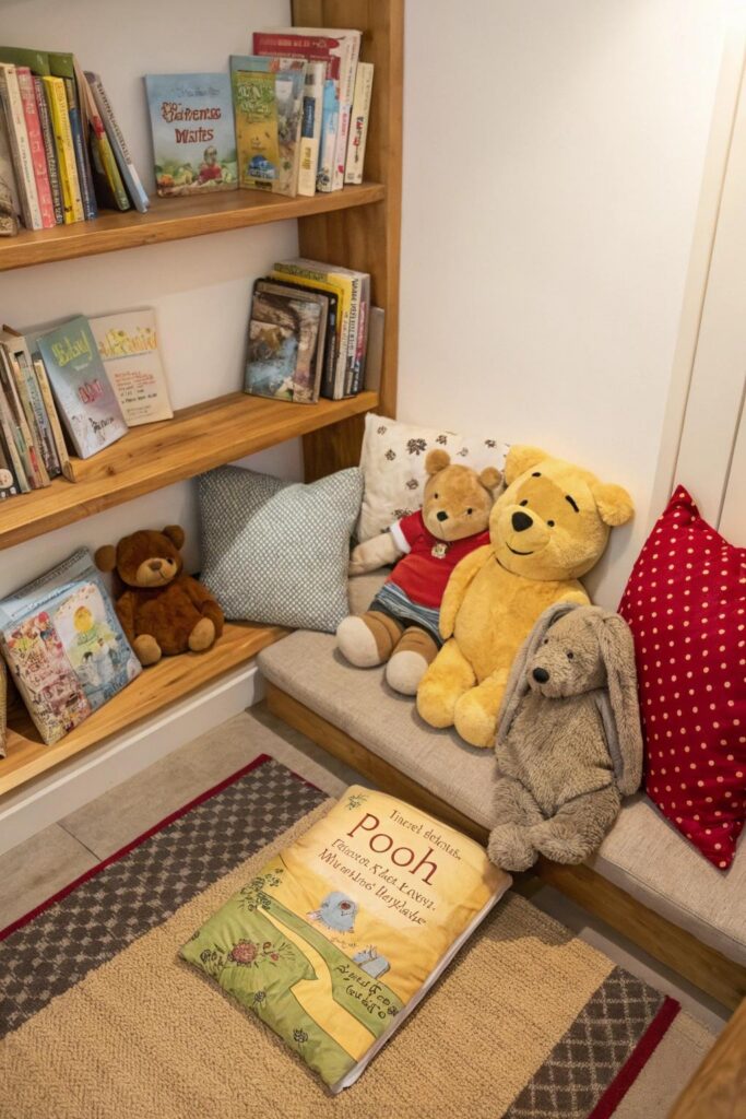 Create a cozy corner with Winnie the Pooh books and plush toys. Add a small rug and cushions for guests to sit and read. This area is perfect for parents with young children.