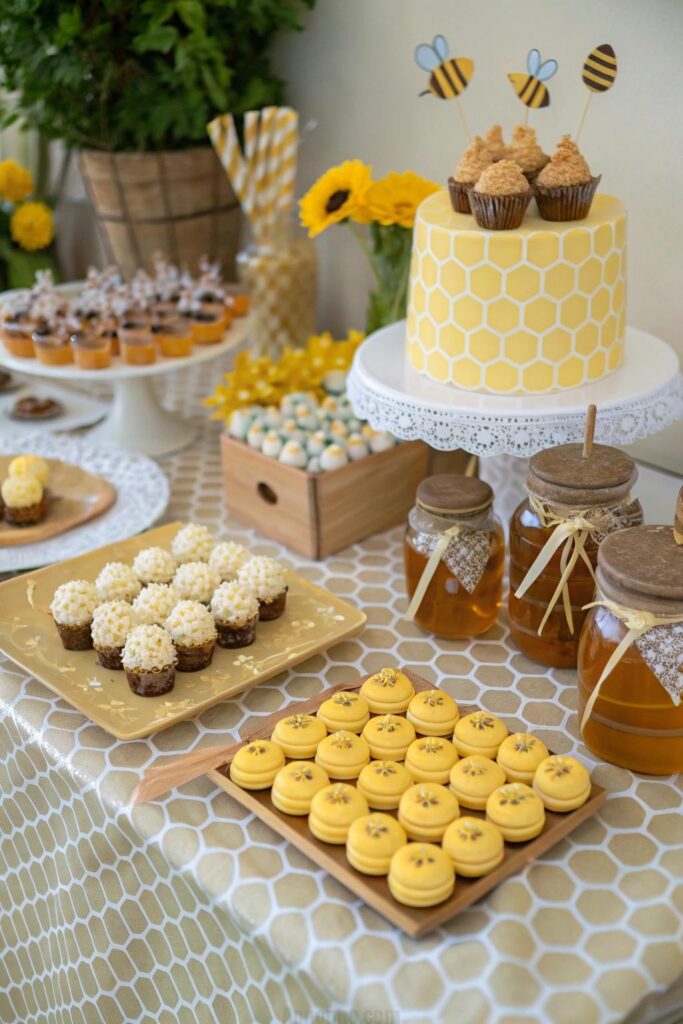Design a dessert table with honey pot-shaped treats and decorations. Use a honeycomb-patterned tablecloth and add small jars of honey as accents. Include cupcakes, cookies, and a Winnie the Pooh-themed cake.