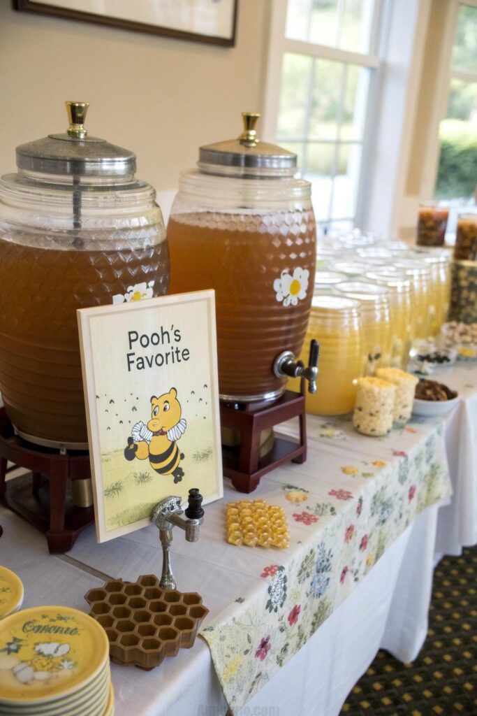 Set up a drink station with honey pot-shaped dispensers. Serve lemonade, iced tea, or honey-flavored drinks. Add labels like “Pooh’s Favorite Brew” for a playful touch.