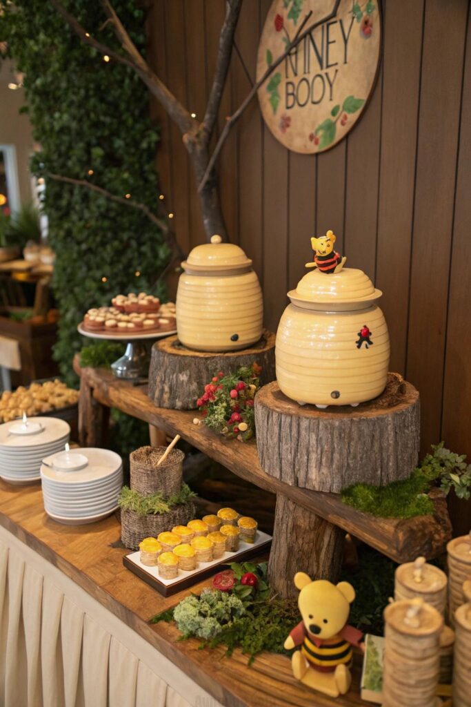 Create a food station with woodland-inspired dishes and decorations. Use honey pot-shaped serving dishes and add small bee or Pooh Bear cutouts as accents. Include a sign that says “Pooh’s Favorite Treats.”