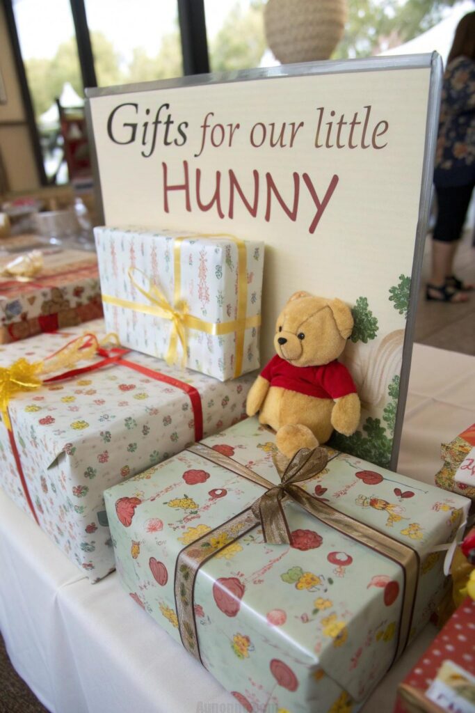 Set up a gift table with Winnie the Pooh-themed wrapping paper and ribbons. Add a sign that says “Gifts for Our Little Hunny” to guide guests. Include a small Pooh Bear plush toy as a centerpiece.