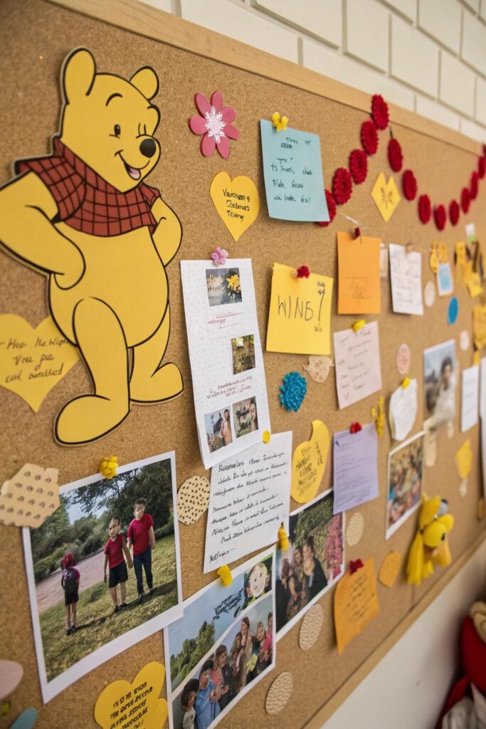 Create a memory wall where guests can pin notes, photos, or wishes for the baby. Use a corkboard or string lights to display the messages. Add Pooh Bear cutouts and honeycomb accents for decoration.