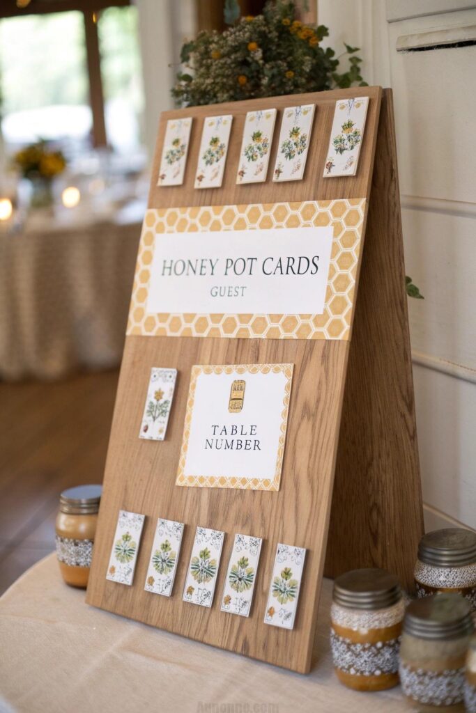 Create a seating chart using honey pot-shaped cards. Write each guest’s name and table number on the cards. Display them on a wooden board or honeycomb-shaped stand.