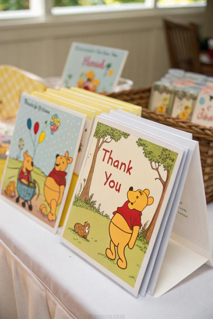 Design Winnie the Pooh-themed thank you cards for after the shower. Use illustrations of Pooh and his friends to match the theme. Include a heartfelt message to show your appreciation.