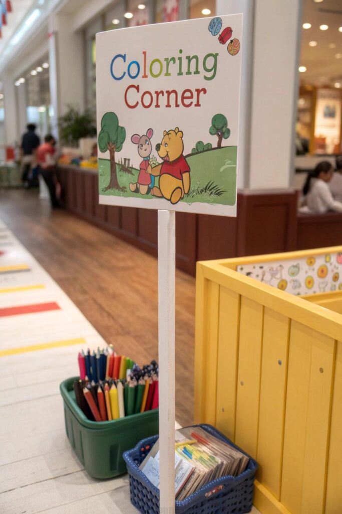Place signs around the venue to guide guests to different activities. Use Winnie the Pooh illustrations and phrases like “Coloring Corner” or “Honey Pot Games.”