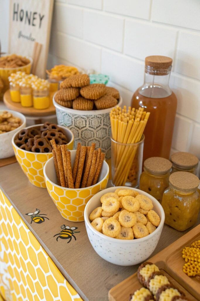 Set up a snack bar with honey-themed treats like honeycomb candy, honey-glazed nuts, and honey-flavored popcorn. Use honey pot-shaped bowls and jars for serving.