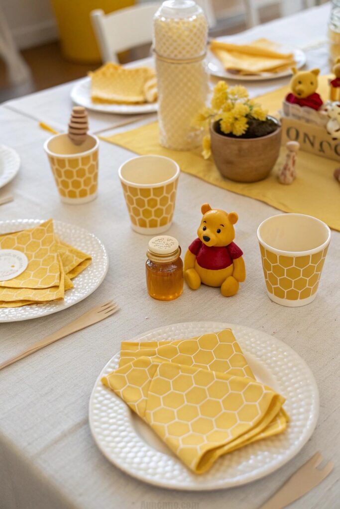 Set each table with honeycomb-patterned plates, napkins, and cups. Add small honey pot centerpieces and Pooh Bear figurines. Use yellow and gold tones to create a cohesive look.