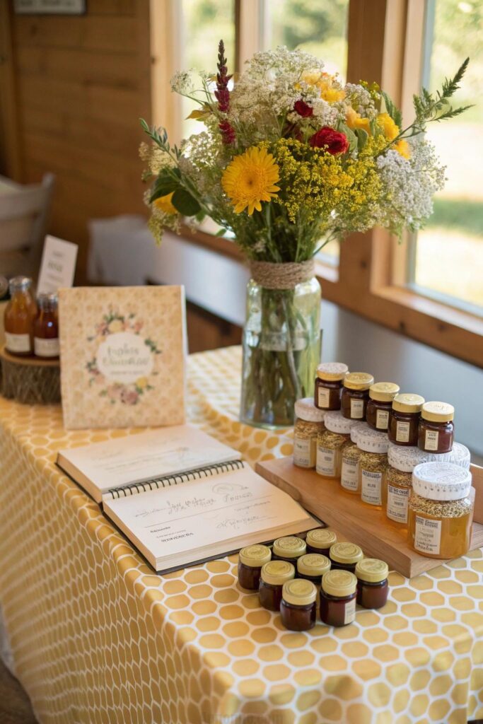 Design a welcome table with honey pot centerpieces and a guest book. Use a honeycomb-patterned tablecloth and add small jars of honey as favors. Include a sign-in sheet with prompts like “Wishes for Baby” or “Advice for Parents.”