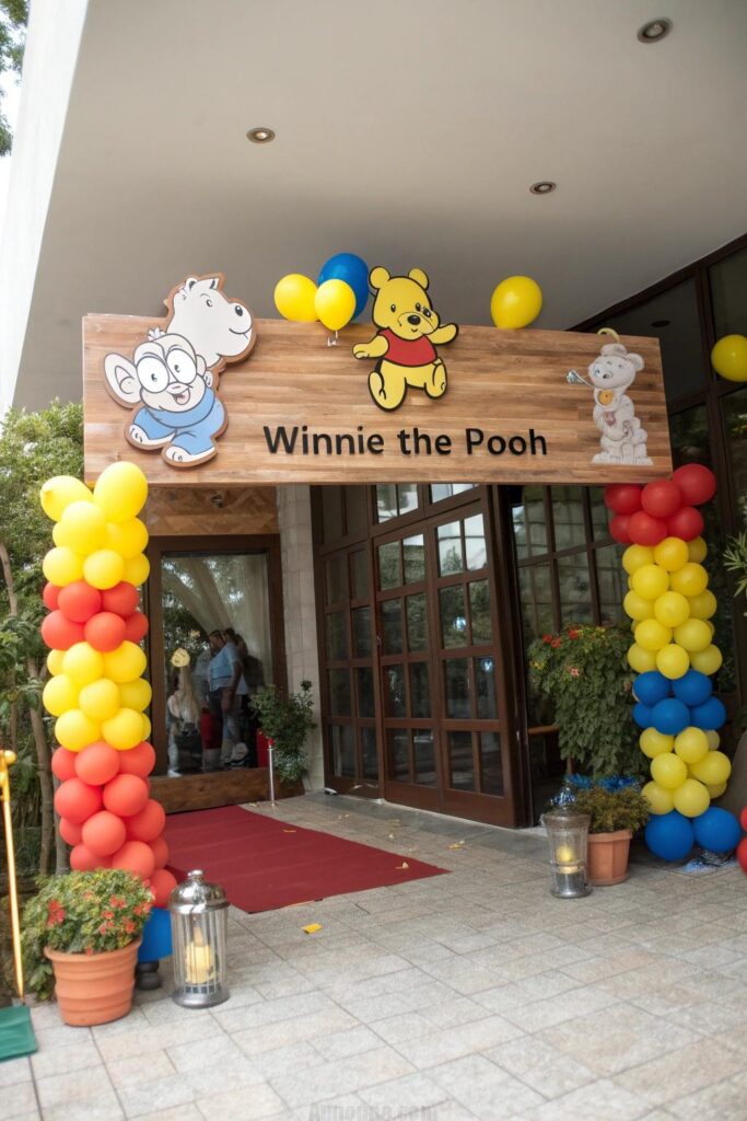 Design a balloon arch in yellow, red, and blue to match the theme. Add honeycomb-shaped balloons and small bee or Pooh Bear cutouts for extra charm. Place the arch at the entrance or as a backdrop for photos.