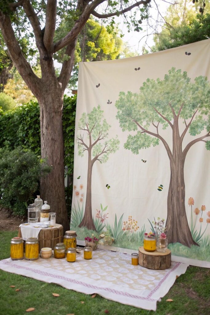 Create a backdrop featuring trees, honey pots, and bees for photos or as a focal point. Use fabric, paper, or even a printed design to bring the Hundred Acre Wood to life.