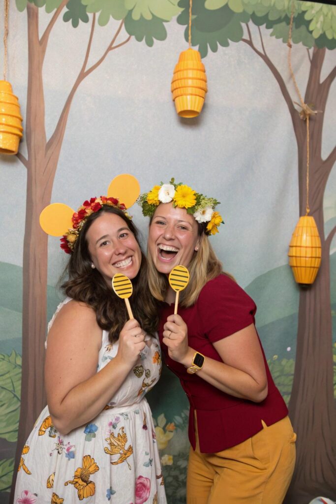Set up a photo booth with a woodland backdrop featuring trees, honey pots, and bees. Provide props like Pooh ears, honey dippers, and flower crowns for guests to use. Include a sign that says “Say Hunny!” to encourage fun photos.
