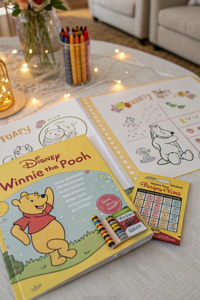 Provide activity booklets with Winnie the Pooh-themed games, puzzles, and coloring pages. Include a small pack of crayons or markers for guests to use. This keeps everyone entertained throughout the event.