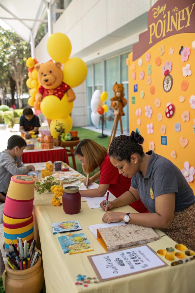 Set up an activity station with Winnie the Pooh-themed crafts and games. Include coloring pages, DIY honey pot favors, and a memory jar for guests to leave messages. This station keeps everyone entertained and engaged.