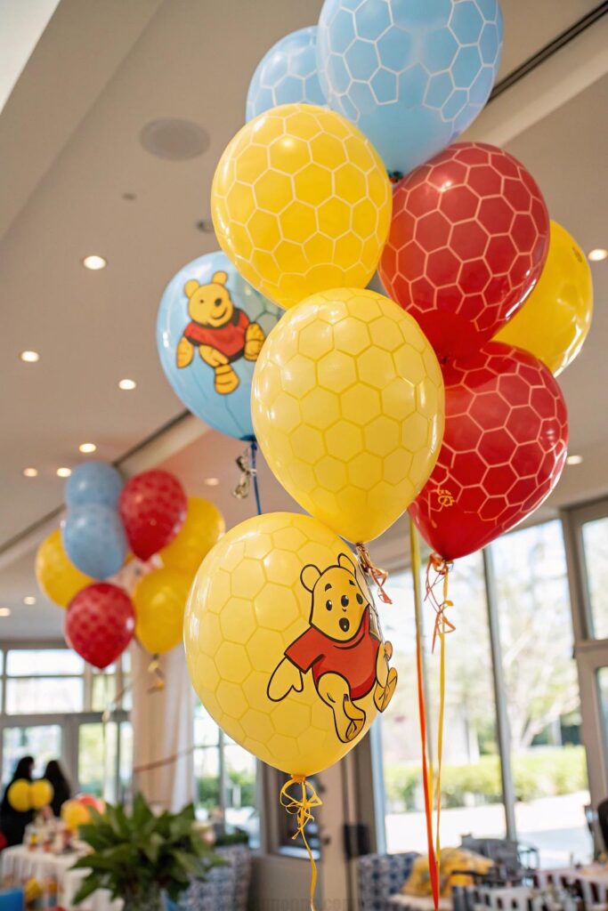 Place balloon bouquets around the venue featuring yellow, red, and blue balloons. Add honeycomb-shaped balloons and small Pooh Bear cutouts for extra charm. These bouquets add a festive touch to any space.