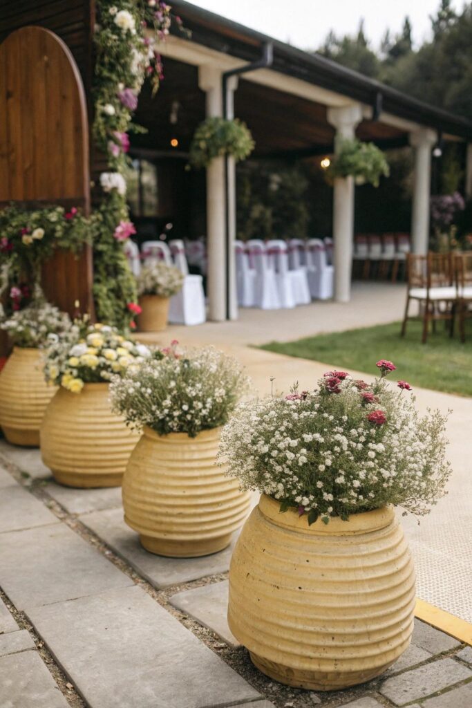 Use honey pot-shaped planters as part of your decor. Fill them with small flowers or succulents and place them around the venue. This adds a natural and charming element to the setup.