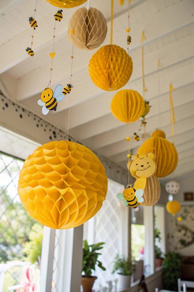 Hang honeycomb-shaped decorations from the ceiling to create a stunning visual effect. Use yellow and gold tones to match the theme. Add small bee or Pooh Bear cutouts for extra charm.
