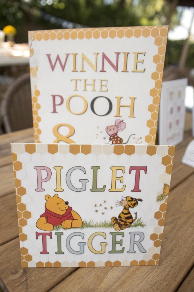 Use Winnie the Pooh-themed table numbers to guide guests to their seats. Create the numbers with Pooh, Piglet, and Tigger illustrations. Add honeycomb accents for a cohesive look.