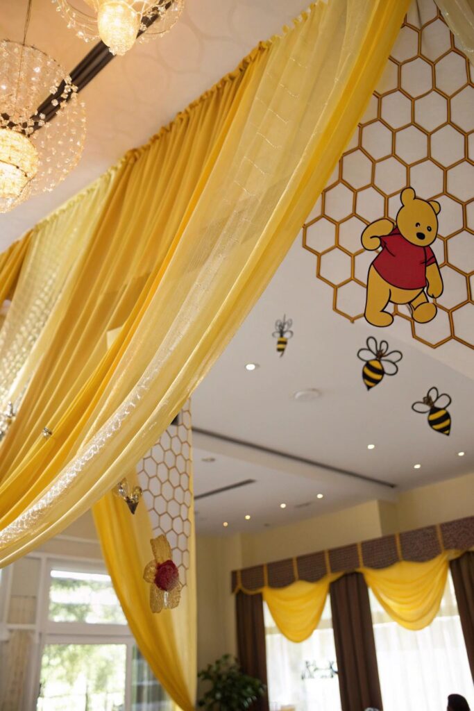 Hang yellow and gold fabric from the ceiling to create a honeycomb-inspired effect. Add small bee or Pooh Bear cutouts for extra charm. This transforms the venue into a magical space.