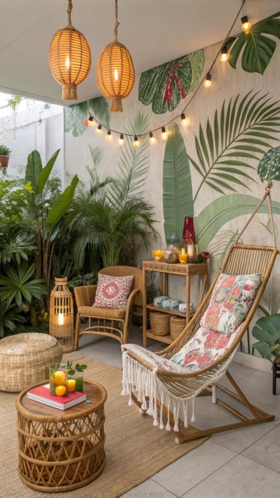 Add a hammock or lounge chair for ultimate relaxation. Use string lights or lanterns for a warm glow. A small bar cart can hold tropical drinks and snacks.