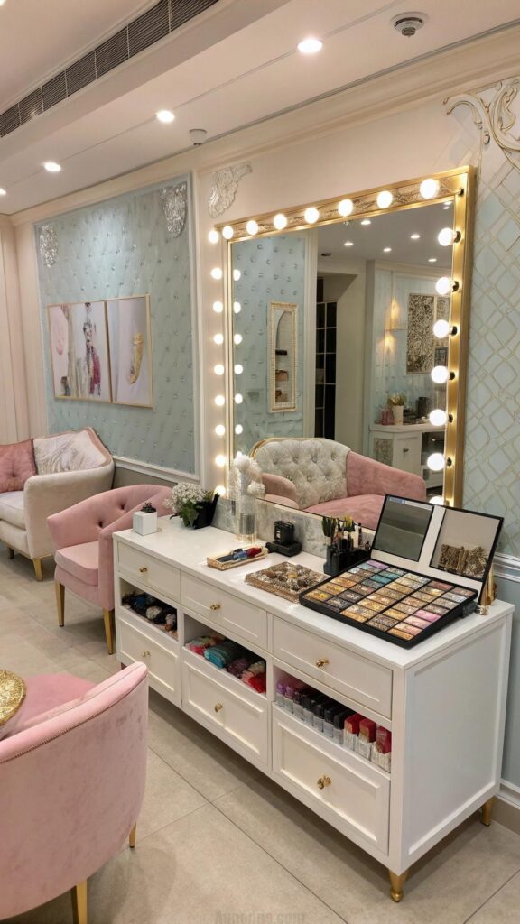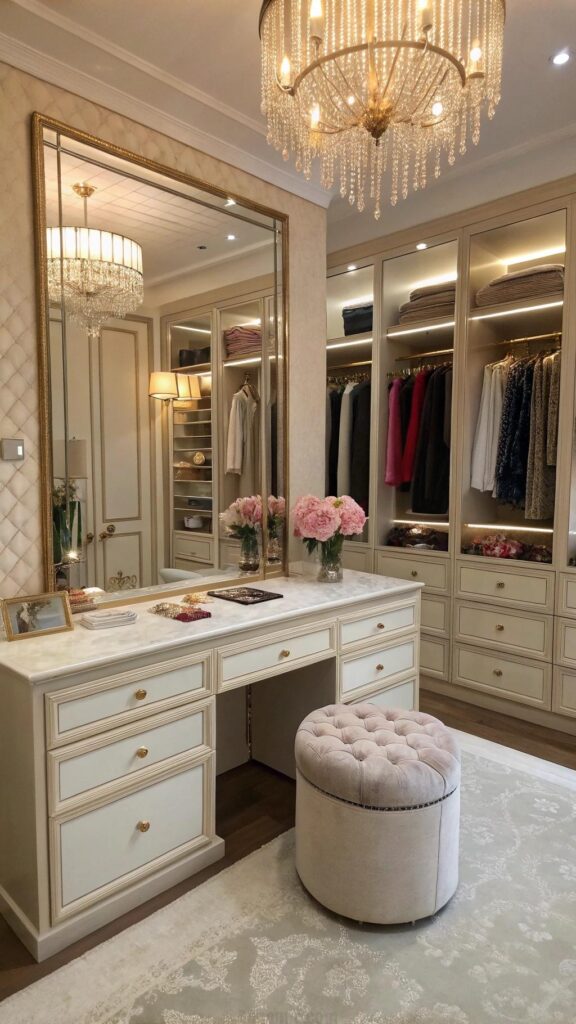 Add a plush stool or chair for comfort. Use trays and organizers to keep your jewelry and accessories tidy. A chandelier or decorative lighting can add a touch of luxury.