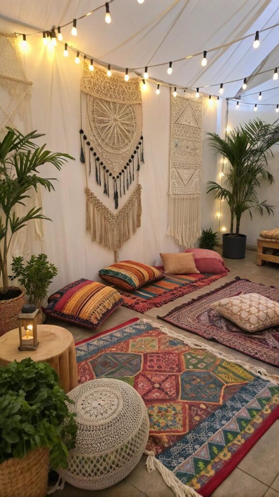 Add string lights or lanterns for a warm glow. Incorporate plants and woven baskets for a boho vibe. A low table can serve as a centerpiece for snacks or drinks.