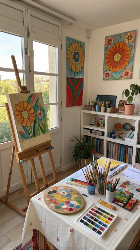 Design an artistic expression space with an easel, sketch pads, and a variety of art supplies. Use bold colors and abstract decor to inspire creativity. This space is perfect for unleashing your inner artist.