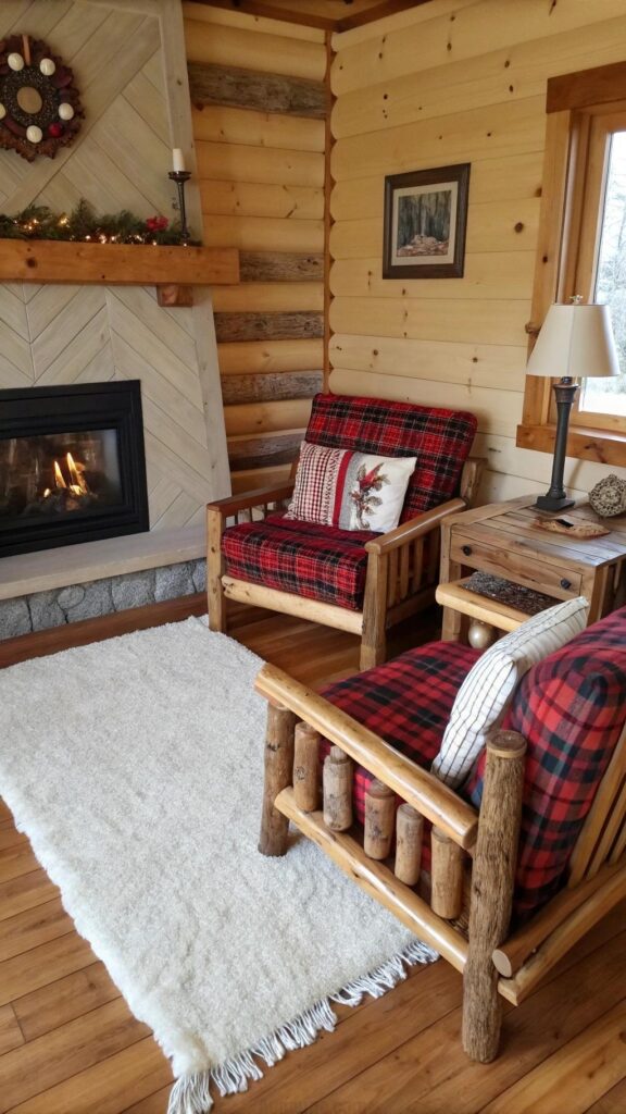 Create a cozy cabin corner with log furniture, plaid patterns, and warm lighting. Use a faux fireplace or candles for extra warmth. This space will feel like a mountain retreat.