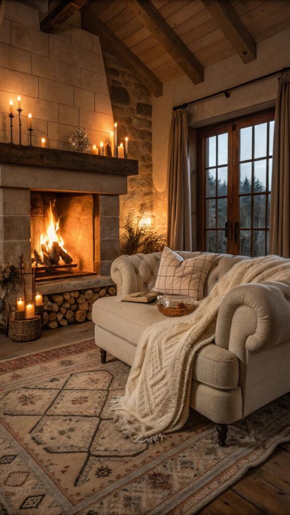 Design a cozy fireplace lounge with a plush sofa, soft blankets, and a roaring fire. Use warm colors and textures to create a welcoming atmosphere. This space is perfect for chilly evenings.