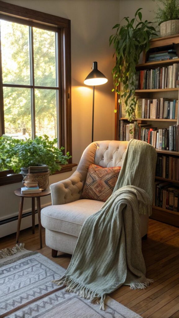 Create a cozy reading nook with a plush armchair, soft blankets, and a small bookshelf. Add a floor lamp for warm lighting and a side table for your coffee or tea. This setup is perfect for escaping into your favorite novels.