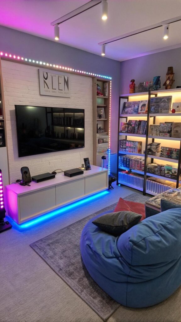 Use LED lights to create a fun and energetic vibe. Keep snacks and drinks nearby for long gaming sessions. A headset and controller stand can keep your gear organized.