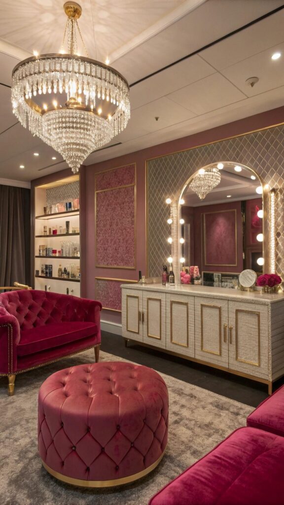 Add a vanity with good lighting for makeup. Use velvet or faux fur for a luxurious touch. A small bar cart can hold your favorite drinks.