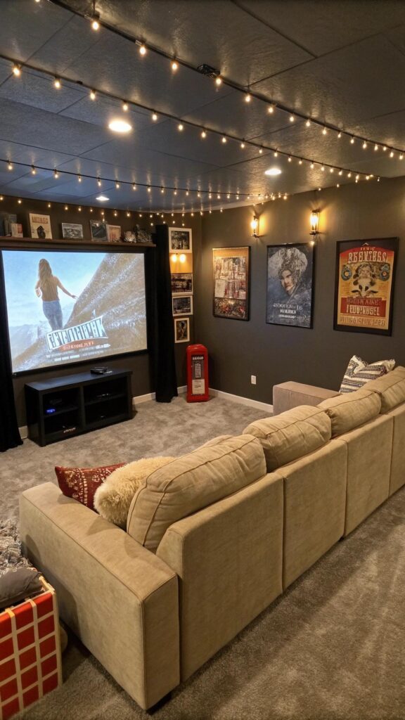Add a popcorn machine and mini bar for movie nights. Use dramatic lighting and a red carpet for a cinematic touch. A photo wall can showcase your favorite Hollywood moments.