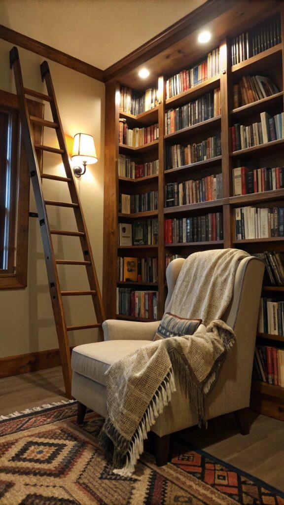Add a ladder for easy access to higher shelves. Use soft lighting and a cozy throw blanket to make the space inviting. A small side table can hold your coffee or tea.