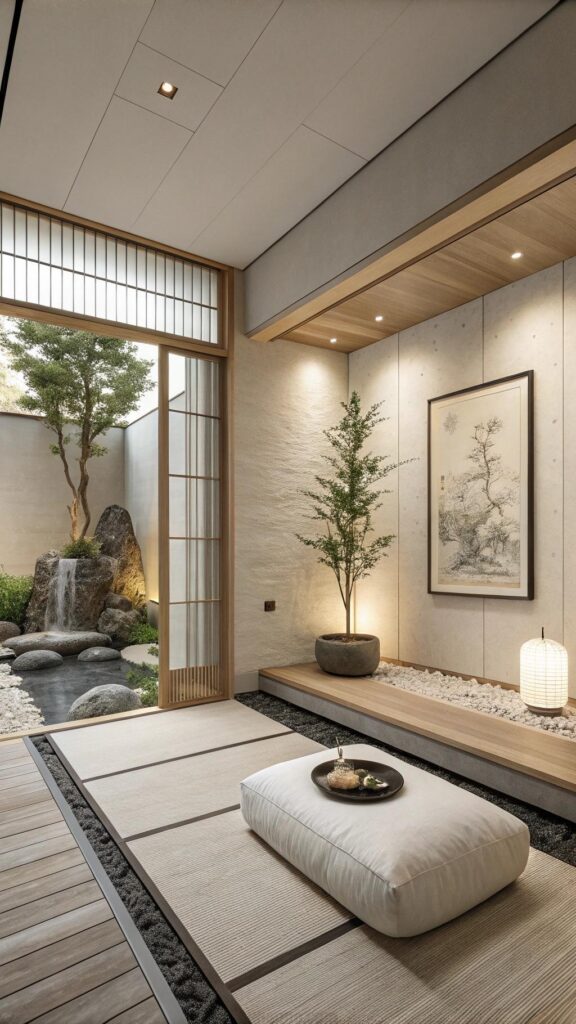 Add a small water feature or diffuser for calming sounds and scents. Keep the space clutter-free with hidden storage. A single piece of artwork can serve as a focal point.