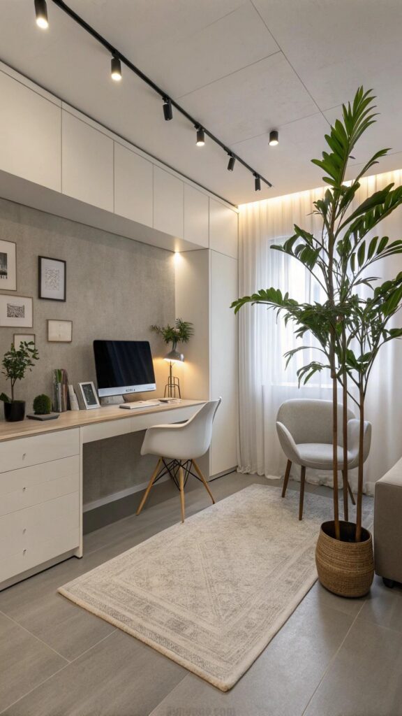 Use calming colors like blues or greens to create a focused atmosphere. Keep your office supplies neatly organized in drawers or trays. A plant or two can add a touch of nature and freshness.