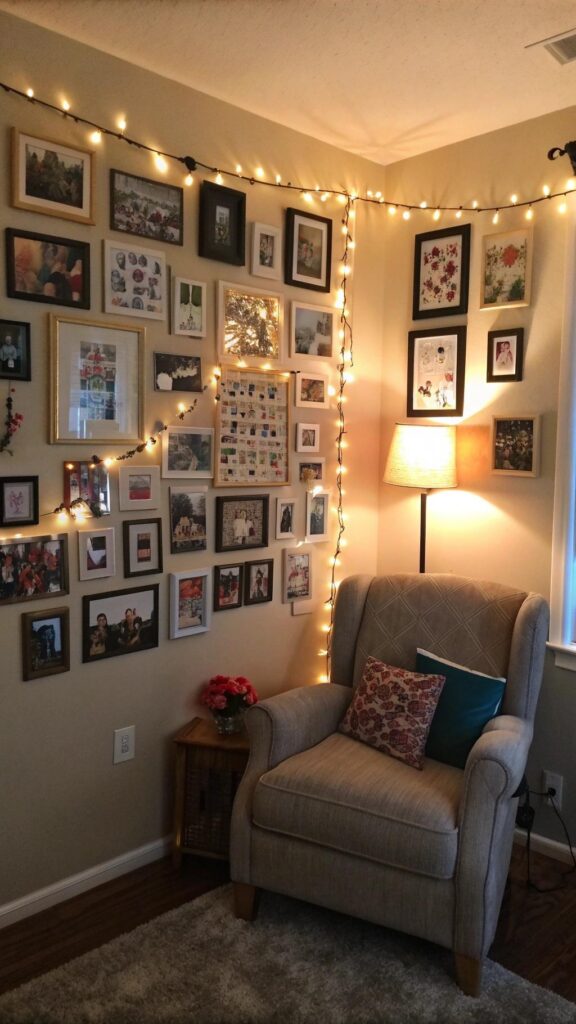 Add a comfortable chair or bench for reflection. Use soft lighting to highlight your memories. A small table can hold a journal or keepsakes.