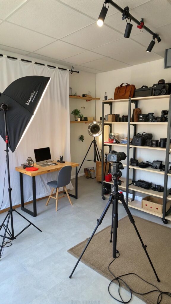 Set up a photography studio with a backdrop, lighting equipment, and a tripod. Use shelves to store your camera gear and props. This space is perfect for capturing your creative vision.