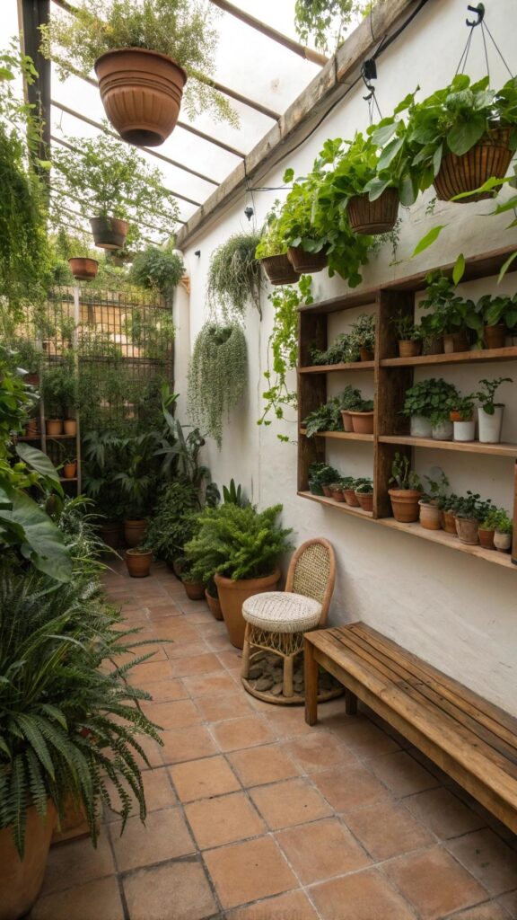 Add a small bench or chair to enjoy the calming atmosphere. Use terracotta pots and woven baskets for a natural look. A watering can and gardening tools can be stored nearby.