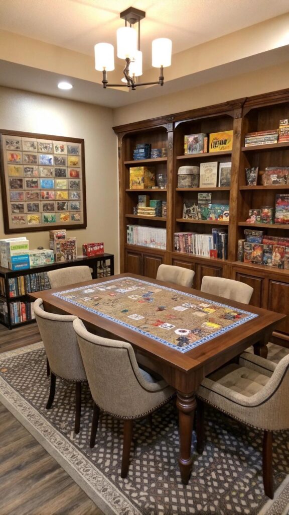 Create a puzzle and game room with a large table, comfortable chairs, and shelves for games and puzzles. Use bright lighting to see small pieces clearly. This space is perfect for family fun or solo challenges.