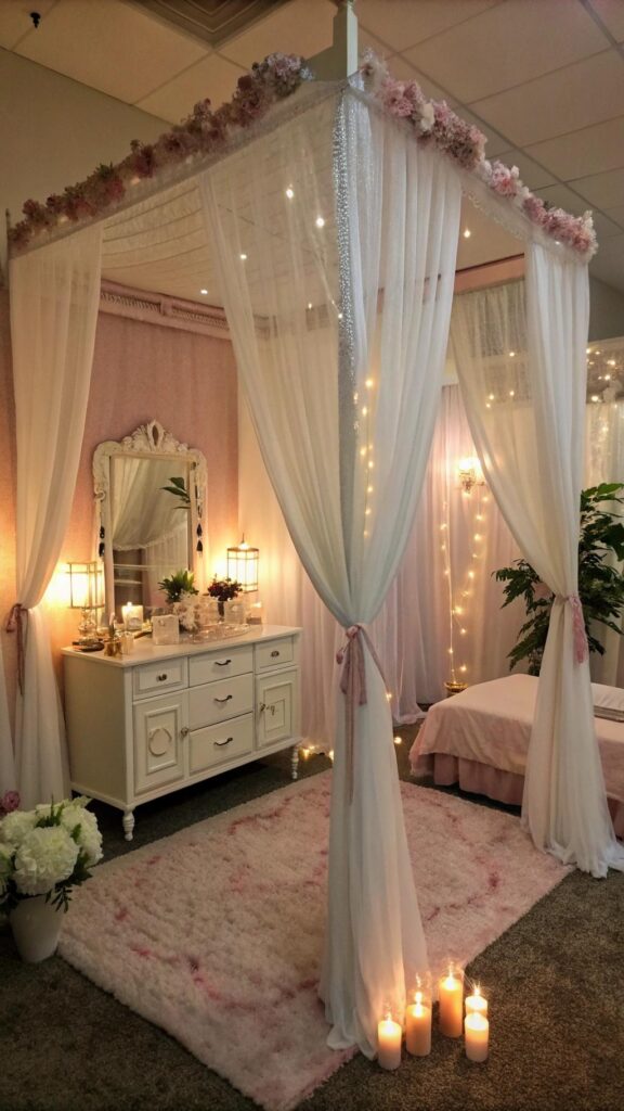 Add a vanity with a plush stool for getting ready. Use candles or fairy lights for soft lighting. A small seating area can complete the look.