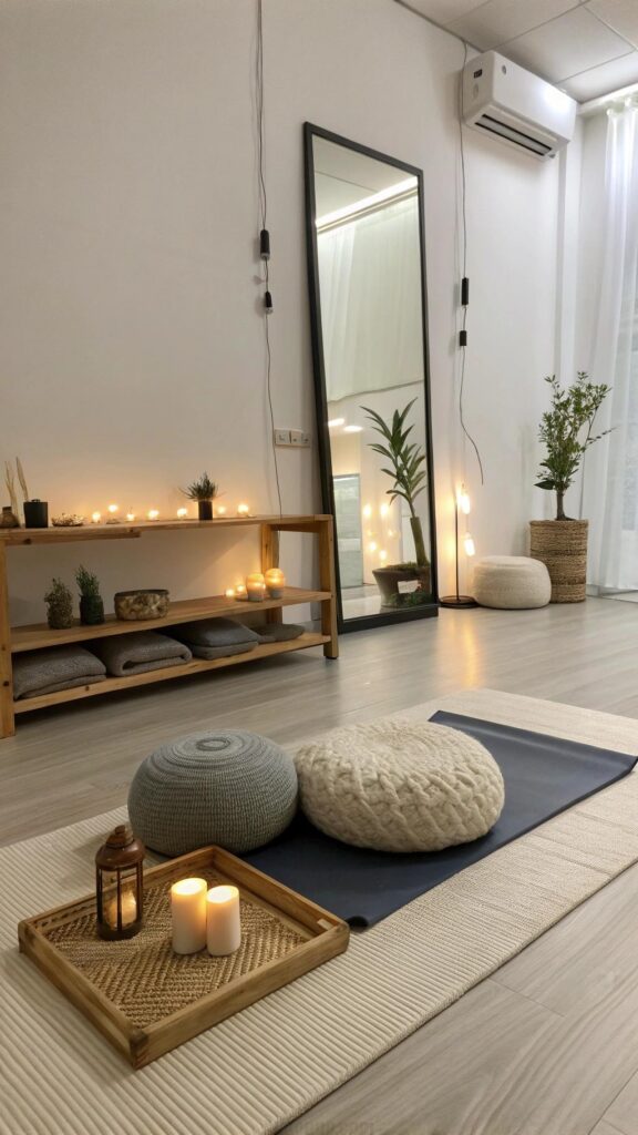 Add a small fountain or diffuser for soothing sounds and scents. Keep your yoga props like blocks and straps nearby for convenience. A mirror on the wall can help you check your form during practice.