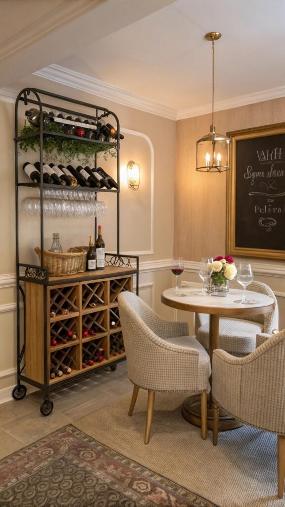 Use warm lighting and rich colors to create a sophisticated atmosphere. Display your favorite bottles and wine accessories as decor. A chalkboard wall can list your wine selections or tasting notes.