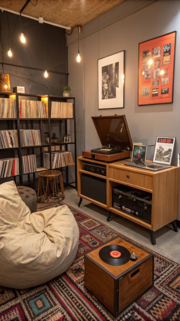 Add a comfortable chair or bean bag for listening. Use shelves to display your records and accessories. A small bar cart can hold drinks and snacks.