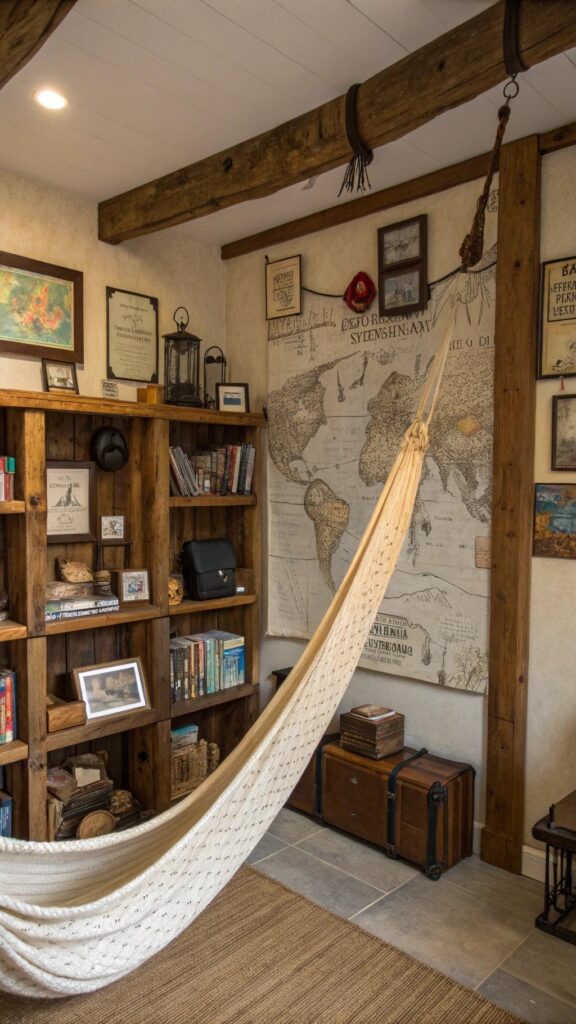 Add a comfortable chair or hammock for relaxation. Use shelves to display your travel books and gear. A small table can hold your coffee or snacks.