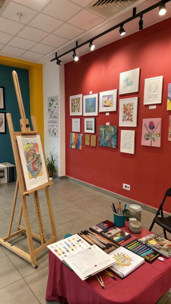 Add a comfortable stool or chair for long sessions. Use good lighting to see your work clearly. A gallery wall can display your finished pieces.