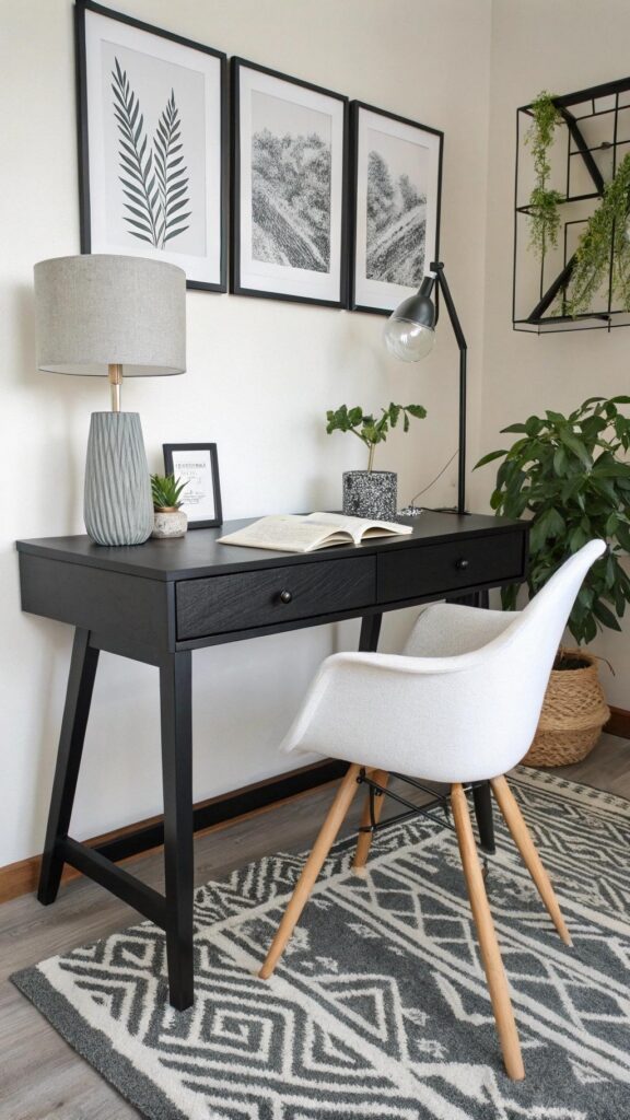 Add minimalist decor like a geometric clock or abstract art. Keep the space clutter-free with hidden storage solutions. A modern office feels professional and stylish.