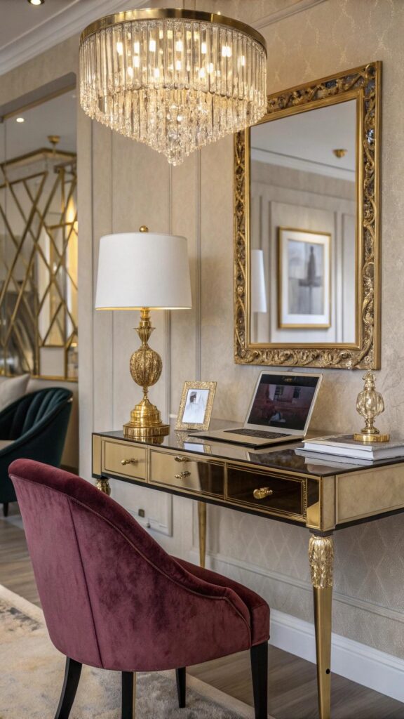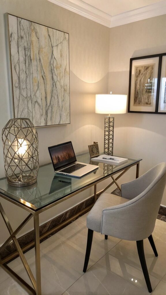 Add metallic decor like gold frames or silver vases. Use soft lighting and a luxurious rug for added opulence. A glamorous office feels sophisticated and inspiring.